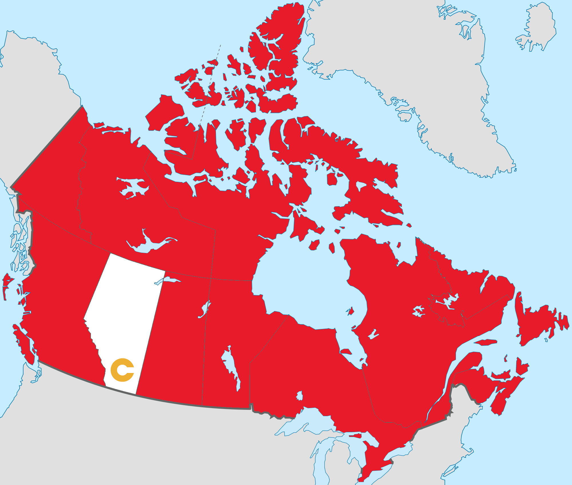The current flag was designed by the now-retired MLA and alderman Yvonne Fritz and Gwin Clarke. It features the letter "C" with a white cowboy hat which is shaped like a hand on a red background. The hat tucked in the letter "C" symbolises the citizens living inside their city. It was adopted in 1983.