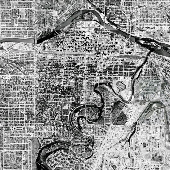 Map of Calgary's downtown made from Google Earth images stitched together by ferreth and showing the Bow and Elbow rivers: